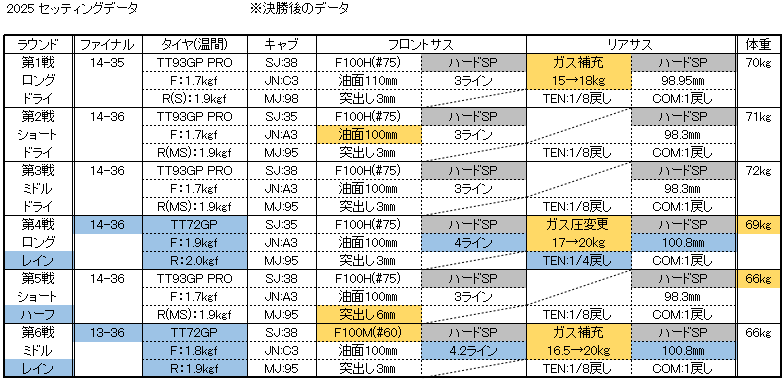 2022年末のマシン購入時は76㎏程体重があり、その後減量を行い今シーズン開幕時は71㎏程まで体重を落とした。しかしレギュレーション上で使用できるハードスプリングでも、70㎏以上は重過ぎて車体姿勢が後ろ下がりになりコーナーの旋回性が落ちると確信した。