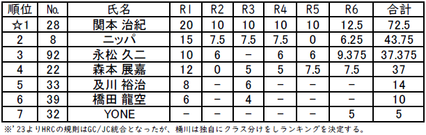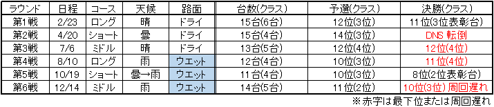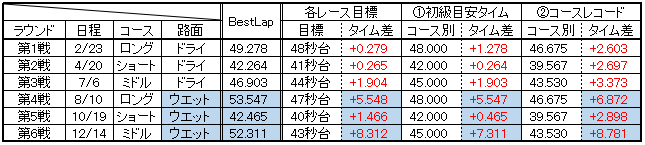 結果、№1は全6戦出場し目標クリア。№2は全戦目標タイムクリアできなかった。