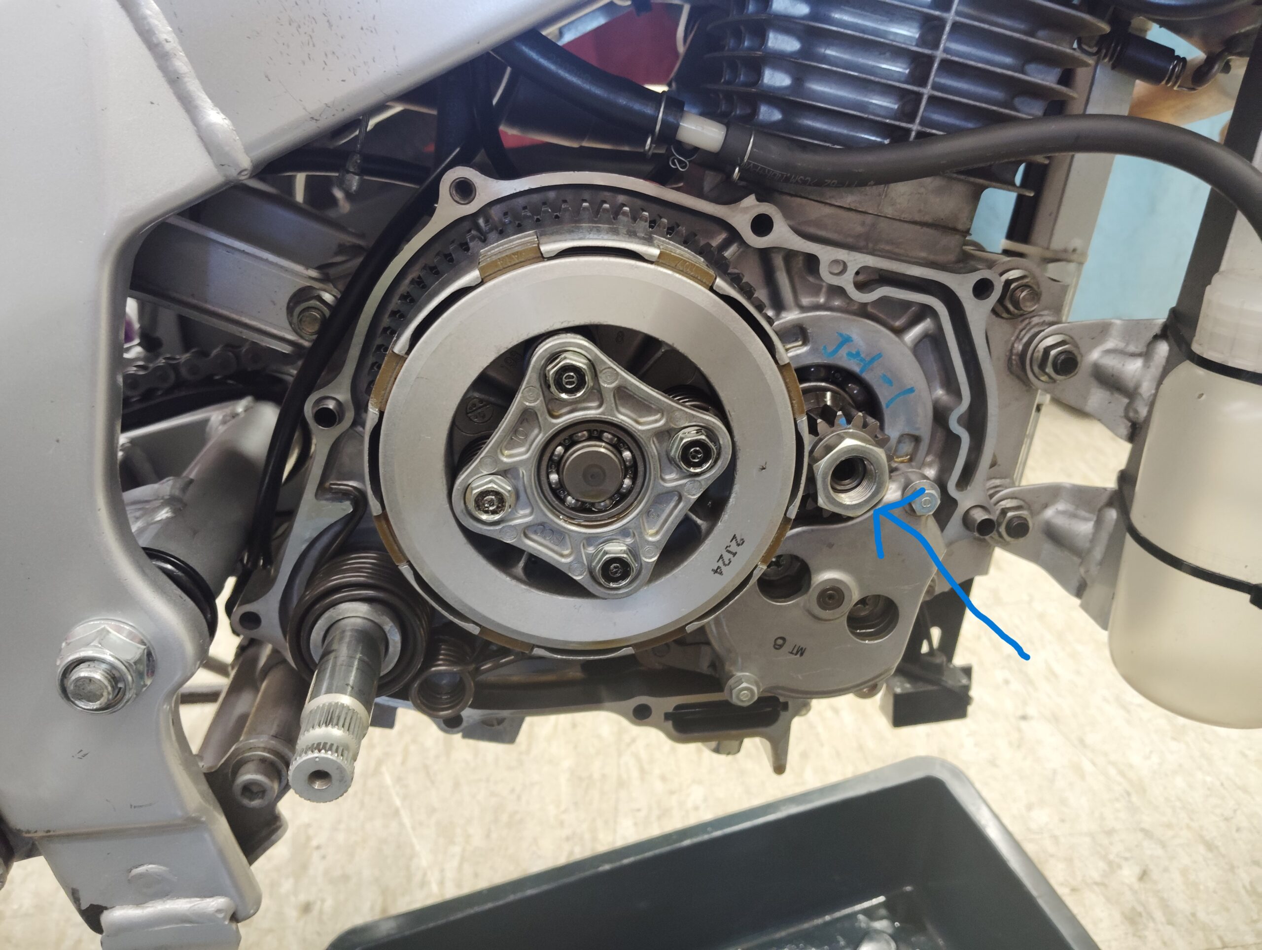 Rケースカバーを外して確認したところ、ナットの緩みによりプライマリドライブギヤがズレ、噛み合いが外れていたことが原因でした。
